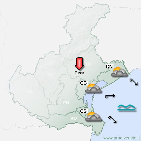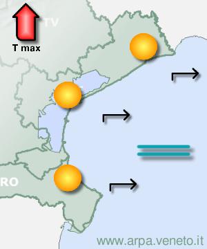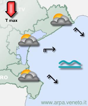 ARPAV Bollettino del 25/03/2026 alle 13:00 aggiornamento del 26/03 alle 09.00 Litorale nordgio 26 marzo mattina gio 26 marzo pomeriggio ven 27 marzo mattina ven 27 marzo pomeriggio sab 28 marzo dom 29 marzo  Cielo: Molto nuvoloso o coperto Temp.: min 4/6 C Precipitazioni: Piogge moderate probabilita' : 80% Vento: Moderati da nord Attendibilita': Buona  Cielo: Nuvoloso o molto nuvoloso Temp.: max 11/13 C Precipitazioni: Modeste piogge locali probabilita' : 20% Vento: Moderati da nordovest Attendibilita': Buona  Cielo: Nuvolosità in diminuzione Temp.: min 0/2 C Precipitazioni: Assenti probabilita' : 0% Vento: Moderati da nordovest Attendibilita': Buona  Cielo: Nuvoloso Temp.: max 11/13 C Precipitazioni: Assenti probabilita' : 0% Vento: Moderati da nord Attendibilita': Buona  Cielo: Sereno o poco nuvoloso Precipitazioni: Assenti probabilita' : 0% Attendibilita': Buona  Cielo: Nuvolosità in aumento Precipitazioni: Assenti probabilita' : 0% Attendibilita': Buona | AVVISO: SEGNALAZIONE METEO. Tra la sera di mercoledì 25 e la prima parte di giovedì 26 tempo instabile/perturbato con precipitazioni a tratti diffuse anche con rovesci; sensibile calo termico con limite nevicate in marcato abbassamento fino ai 600/800 m, localmente e a tratti anche più in basso; significativo rinforzo dei venti dai quadranti settentrionali fino a forti, anche con raffiche localmente molto forti, sia su zone montane e pedemontane per la gran parte di giovedì, che in pianura specie verso la costa fino alle ore centrali di giovedì. | Evoluzione generale Scende rapidamente da nord-ovest un'ampia saccatura d'aria fredda, che giovedì isola un minimo barico sull'Italia, seguito nel fine settimana da un contenuto rialzo della pressione; sul Veneto è dunque prevista una fase perturbata con precipitazioni più presenti nelle prime ore di giovedì, cui seguono rasserenamenti specie da sabato a domenica mattina; spiccano altresì alcune fasi almeno localmente ventose specie fino a venerdì, oltre ad un temporaneo raffreddamento che giovedì mattina porta la neve a quote relativamente basse e nelle mattinate successive può portare qualche brinata fino in pianura. | 25 marzo