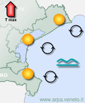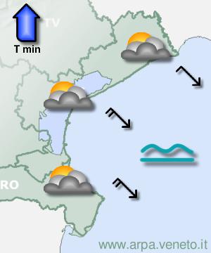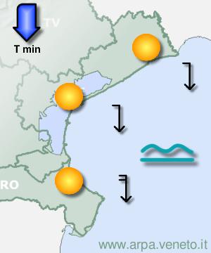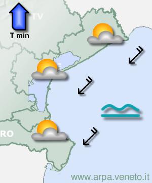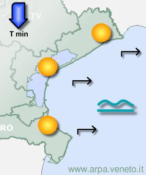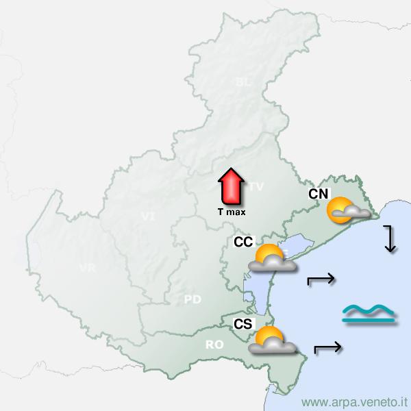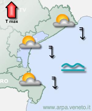 ARPAV Bollettino del 26/03/2026 alle 13:00 aggiornamento del 27/03 alle 09.00 Litorale nordven 27 marzo mattina ven 27 marzo pomeriggio sab 28 marzo mattina sab 28 marzo pomeriggio dom 29 marzo lun 30 marzo  Cielo: Nuvolosità in diminuzione Temp.: min 8/10 C Precipitazioni: Modeste piogge locali probabilita' : 20% Vento: Deboli da nordovest Attendibilita': Buona  Cielo: Nuvolosità in diminuzione Temp.: max 11/13 C Precipitazioni: Assenti probabilita' : 0% Vento: Moderati da nord Attendibilita': Buona  Cielo: In prevalenza sereno Temp.: min -1/1 C Precipitazioni: Assenti probabilita' : 0% Vento: Deboli da nord Attendibilita': Ottima  Cielo: Sereno o poco nuvoloso Temp.: max 15/17 C Precipitazioni: Assenti probabilita' : 0% Vento: Deboli da ovest Attendibilita': Ottima  Cielo: Annuvolamenti e schiarite Precipitazioni: Assenti probabilita' : 0% Attendibilita': Buona  Cielo: Irregolarmente nuvoloso con schiarite Precipitazioni: Qualche pioggia nel pomeriggio/sera probabilita' : 10% Attendibilita': Buona | AVVISO: SEGNALAZIONE METEO. Nel pomeriggio/sera di giovedì 26 e nel corso di venerdì 27 venti spesso forti in quota dai quadranti settentrionali con raffiche di Foehn in alcune valli e a tratti sulla Pedemontana. | Evoluzione generale Una profonda saccatura d'aria fredda proveniente dalle alte latitudini ha già indotto un minimo barico sull'Italia, destinato a migrare verso sud-est lasciando spazio a un temporaneo rialzo della pressione, e ne induce un altro domenica sul Mediterraneo occidentale; per il Veneto ne conseguono parecchie nubi a inizio periodo, rasserenamenti più ampi venerdì, nubi irregolari in seguito con probabile ritorno di qualche precipitazione da lunedì pomeriggio; la situazione barica, specie all'inizio, è favorevole ad episodi di Foehn nelle valli e sulla fascia pedemontana; spicca un aumento dell'escursione termica diurna, con temperature minime che nelle prime ore di sabato possono portare lievi brinate fino in pianura. | 26 marzo