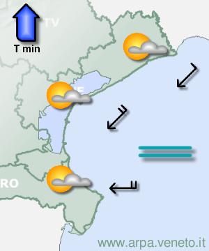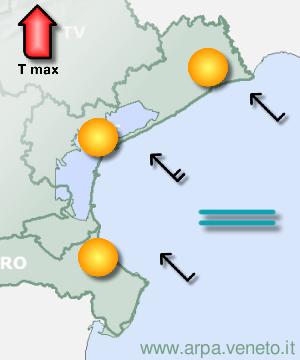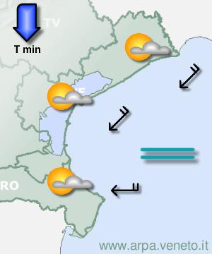 ARPAV Bollettino del 09/04/2026 alle 13:00 aggiornamento del 10/04 alle 09.00 Litorale nordven 10 aprile mattina ven 10 aprile pomeriggio sab 11 aprile mattina sab 11 aprile pomeriggio dom 12 aprile lun 13 aprile  Cielo: Parzialmente nuvoloso Temp.: min 5/7 C Precipitazioni: Assenti probabilita' : 0% Vento: Deboli da nordest Attendibilita': Ottima  Cielo: Parzialmente nuvoloso Temp.: max 17/19 C Precipitazioni: Assenti probabilita' : 0% Vento: Deboli da est Attendibilita': Ottima  Cielo: Poco nuvoloso Temp.: min 6/8 C Precipitazioni: Assenti probabilita' : 0% Vento: Moderati da nordest Attendibilita': Buona  Cielo: Poco nuvoloso Temp.: max 18/20 C Precipitazioni: Assenti probabilita' : 0% Vento: Deboli da sudest Attendibilita': Buona  Cielo: Nuvolosità in aumento Precipitazioni: Assenti probabilita' : 0% Attendibilita': Discreta  Cielo: Nuvoloso Precipitazioni: Generalmente assenti probabilita' : 0% Attendibilita': Discreta Evoluzione generale Fino a domenica mattina il tempo anche sulla nostra regione è sostanzialmente stabile, per un promontorio anticiclonico che si protende dal Nord Africa verso l'Europa; a fine periodo, un po' più nubi e qualche possibile precipitazione, per una circolazione che da ovest diviene leggermente ciclonica. | 9 aprile