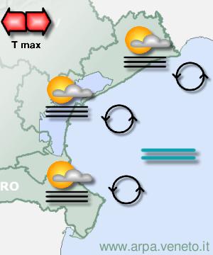 ARPAV Bollettino del 26/02/2026 alle 13:00 aggiornamento del 26/02 alle 16.00 Litorale nordven 27 febbraio mattina ven 27 febbraio pomeriggio sab 28 febbraio mattina sab 28 febbraio pomeriggio dom 1 marzo lun 2 marzo  Cielo: Nebbie/nubi basse in parziale dissolvimento Temp.: min 6/8 C Precipitazioni: Assenti probabilita' : 0% Vento: Variabili Attendibilita': Buona  Cielo: Nebbie in parziale dissolvimento Temp.: max 13/15 C Precipitazioni: Assenti probabilita' : 0% Vento: Variabili Attendibilita': Buona  Cielo: Nebbie/nubi basse in parziale dissolvimento Temp.: min 5/7 C Precipitazioni: Assenti probabilita' : 0% Vento: Variabili Attendibilita': Buona  Cielo: Sereno o poco nuvoloso Temp.: max 12/14 C Precipitazioni: Assenti probabilita' : 0% Vento: Variabili Attendibilita': Buona  Cielo: Molto nuvoloso Precipitazioni: Assenti probabilita' : 0% Attendibilita': Buona  Cielo: Nuvoloso o molto nuvoloso Precipitazioni: Deboli sparse probabilita' : 50% Attendibilita': Discreta Evoluzione generale Una vasta area di alta pressione in espansione sulle zone centro-occidentali del Mediterraneo manterrà il tempo stabile fino a sabato, ma con forte ristagno di umidità nei bassi livelli dell'atmosfera, che determinerà condizioni favorevoli alla formazione di foschie, nebbie e nubi basse in pianura e nelle valli, soprattutto nelle ore più fredde. Da domenica la pressione in quota inizierà lievemente a cedere per l'avvicinamento di una saccatura in avvicinamento da ovest, che tenderà a scorrere a nord dell'arco alpino, con tendenza ad aumento della nuvolosità, ma con precipitazioni generalmente assenti o al più deboli locali domenica, più probabili lunedì, specie in pianura. | 26 febbraio
