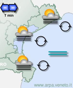 Tempo atteso: Tempo stabile con foschie, nubi basse e nebbie estese, in parziale dissolvimento durante le ore centrali, localmente persistenti lungo la costa. Precipitazioni: Assenti. Temperature: Minime stazionarie o in locale aumento, massime senza notevoli variazioni o localmente in diminuzione nelle zone interessate da nebbie persistenti. Venti: Deboli variabili. Mare: Calmo. Attendibilità: Buona