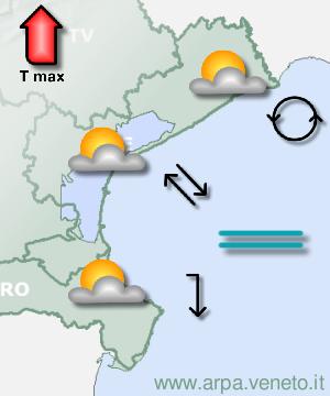 ARPAV Bollettino del 14/04/2026 alle 13:00 aggiornamento del 14/04 alle 16.00 Litorale nordmer 15 aprile mattina mer 15 aprile pomeriggio gio 16 aprile mattina gio 16 aprile pomeriggio ven 17 aprile sab 18 aprile  Cielo: Nuvolosità in diminuzione Temp.: min 11/13 C Precipitazioni: Modeste piogge locali probabilita' : 50% Vento: Moderati da nordest Attendibilita': Buona  Cielo: Annuvolamenti e schiarite Temp.: max 22/24 C Precipitazioni: Generalmente assenti probabilita' : 0% Vento: Variabili Attendibilita': Buona  Cielo: Annuvolamenti e schiarite Temp.: min 9/11 C Precipitazioni: Assenti probabilita' : 0% Vento: Deboli da nordest Attendibilita': Buona  Cielo: Annuvolamenti e schiarite Temp.: max 23/25 C Precipitazioni: Assenti probabilita' : 0% Vento: Variabili Attendibilita': Buona  Cielo: Annuvolamenti e schiarite Precipitazioni: Assenti probabilita' : 0% Attendibilita': Buona  Cielo: Annuvolamenti e schiarite Precipitazioni: Generalmente assenti probabilita' : 0% Attendibilita': Discreta Evoluzione generale A inizio periodo si esaurisce gradualmente una moderata depressione centrata tra l'Italia e il Nord Africa, che sulla nostra regione ha portato correnti umide con molte nubi e delle precipitazioni; in seguito la circolazione si fa leggermente anticiclonica e permette una variabilità con maggiori spazi di sereno, nubi meno insistenti e precipitazioni più rade, oltre ad una significativa ripresa dell'escursione termica diurna. | 14 aprile