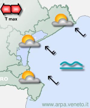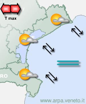 ARPAV Bollettino del 17/04/2026 alle 13:00 aggiornamento del 18/04 alle 09.00 Litorale nordsab 18 aprile mattina sab 18 aprile pomeriggio dom 19 aprile mattina dom 19 aprile pomeriggio lun 20 aprile mar 21 aprile  Cielo: Poco nuvoloso Temp.: min 13/15 C Precipitazioni: Assenti probabilita' : 0% Vento: A regime di brezza Attendibilita': Buona  Cielo: Poco nuvoloso Temp.: max 22/24 C Precipitazioni: Assenti probabilita' : 0% Vento: A regime di brezza Attendibilita': Buona  Cielo: Sereno o poco nuvoloso Temp.: min 9/11 C Precipitazioni: Assenti probabilita' : 0% Vento: A regime di brezza Attendibilita': Buona  Cielo: Nuvolosità in aumento Temp.: max 21/23 C Precipitazioni: Rovesci o temporali locali probabilita' : 40% Vento: Deboli da sudest Attendibilita': Buona  Cielo: Annuvolamenti e schiarite Precipitazioni: Sparse anche a carattere di rovescio probabilita' : 50% Attendibilita': Buona  Cielo: Annuvolamenti e schiarite Precipitazioni: Sparse anche a carattere di rovescio/temporale probabilita' : 50% Attendibilita': Discreta Evoluzione generale Fino a sabato la presenza dell'anticiclone delle Azzorre garantirà tempo in prevalenza stabile e soleggiato. Domenica la pressione cederà, per l'avvicinamento di una saccatura da nord che farà il suo ingresso lunedì. Il tempo sulla regione fino a martedì diverrà quindi instabile, a partire dalle zone montane e in seguito anche sulla pianura, con fasi di precipitazioni, anche a carattere di rovescio e temporale. Le temperature massime saranno ben superiori alla media fino a domenica, per poi calare da lunedì, riportandosi nella media o lievemente inferiori in montagna. | 17 aprile